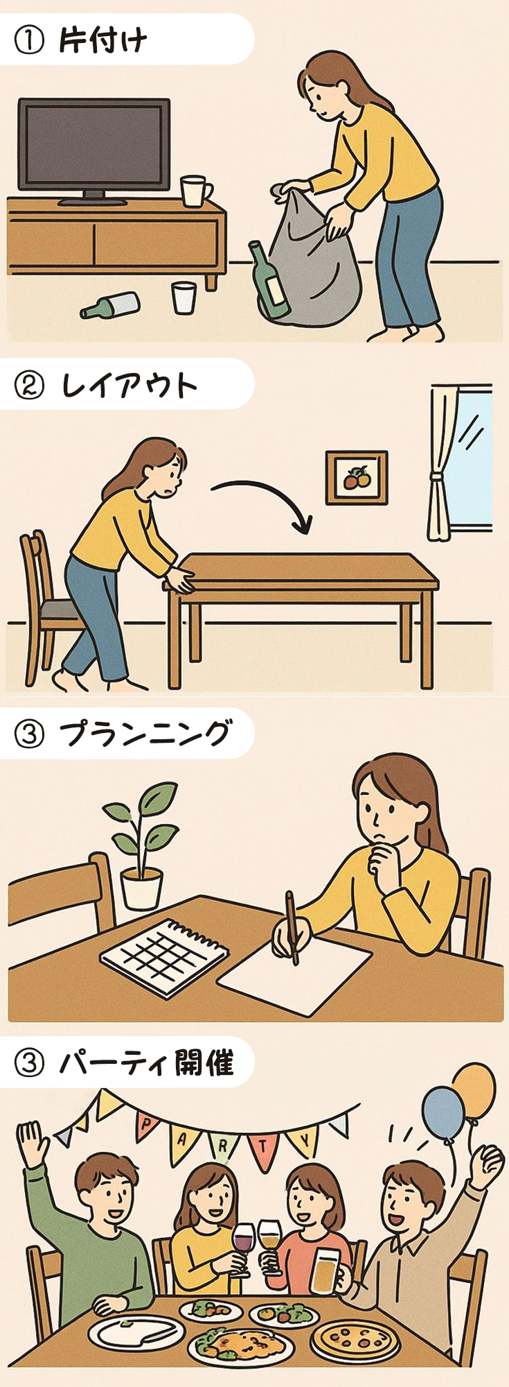 パーティ開催 = パーティ!自分も楽しく、来訪者にも温かく、ハプニングにも笑顔で楽しみましょう